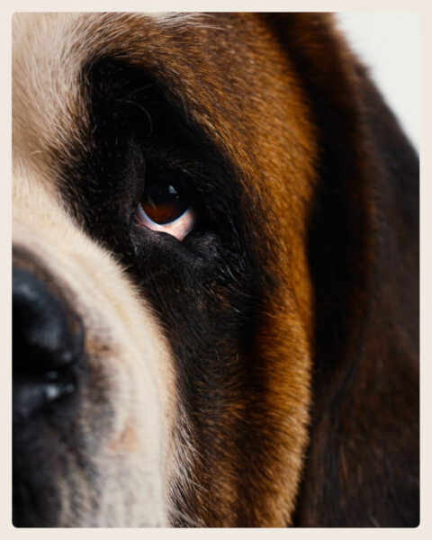 Extrem enge Kadrierung, weiches weisses Licht, fast klinisch. Jede Capsule beginnt mit einem kaum erkennbaren Detail: ein Fell-Flanke, eine Pfote, eine Schnauze. Die Enthüllung baut sich Einstellung für Einstellung auf, bis zur abschliessenden Totalen. Der Bernhardiner schaut uns an. Würdevoll.