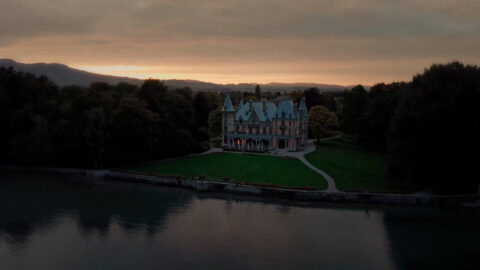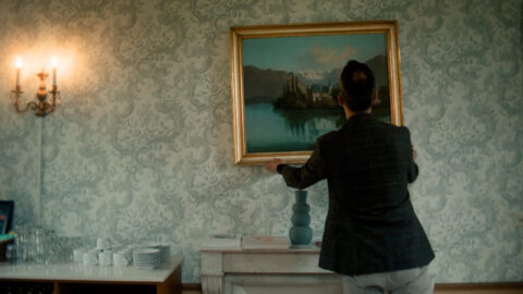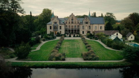 Les vues aériennes des jardins en anamorphique font de la géométrie du domaine quelque chose de presque abstrait. Jacob, seul dans le paysage, devient minuscule, à peine un point dans la vastitude du cadre. C’est là que la lumière de fin de journée sur le lac fait le reste.